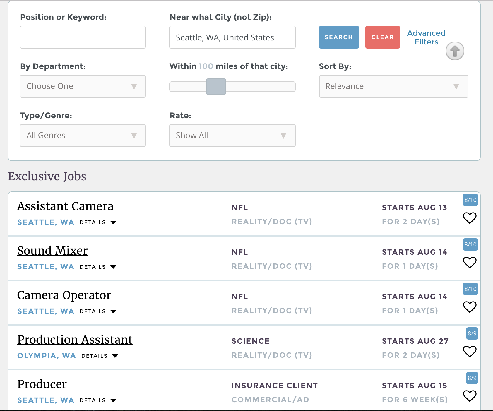 In the photo above you see a basic search for any video production job near Seattle, WA. You can see in the first listing that a production company is producing something for the NFL and they need an AC (Assistant Camera) for two days starting August 13th, and that it was posted August 10th. You can also see that the type of production is REALITY/DOC (TV).