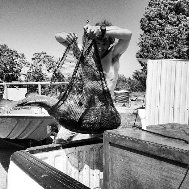Generally speaking, your first job on a video production will be a (PA) Production Assistant. The way I like to explain to people what their job duties are is to ask them to think of the people they see on TV with headsets, carrying coffee and a notepad doing everything for the 'important' people. This is a picture of me on my first Reality TV gig for History Channel. Think I would be holding a camera? Me too. But no! I'm holding a 46 lbs. catfish. This is what I mean by "doing everything for the important people." You might have the opportunity to hold a camera, change a battery, fix a light or help with the Art Department. But be prepared to do ANYTHING that production asks you to do unless you want to be fired!